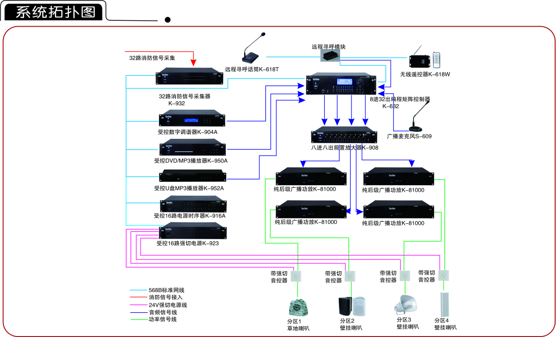 4.服務臺信息播放;服務臺利用KING-BANG廣播遠程尋呼站,進行廣播通知、信息播報、找人等。消防緊急廣播: